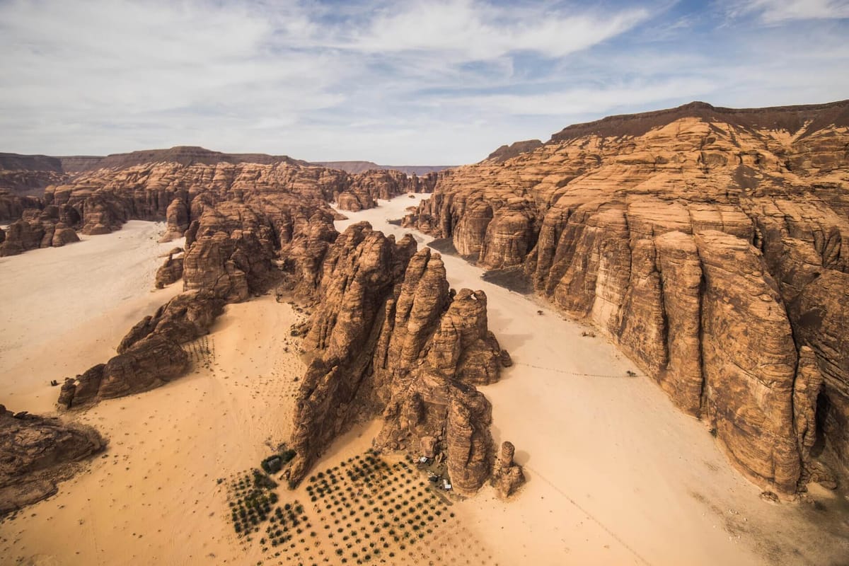 There are some parts of AlUla that have dark rocks exposed, not the typical sandstones that are iconic to the region. Enormous areas covering hundreds of square kilometres of flat, black rocks. These are the remains of relatively recent lava flows. Between 10 million and just half a million years ago, AlUla would have been even hotter than it is today, as volcanoes erupted across the landscape. They were not the typical explosive type you might imagine when you think of volcanoes, like Mount Fuji or Mount St Helens, which form from the melting of the Earth’s crust as it is forced down into the Earth (called subduction).